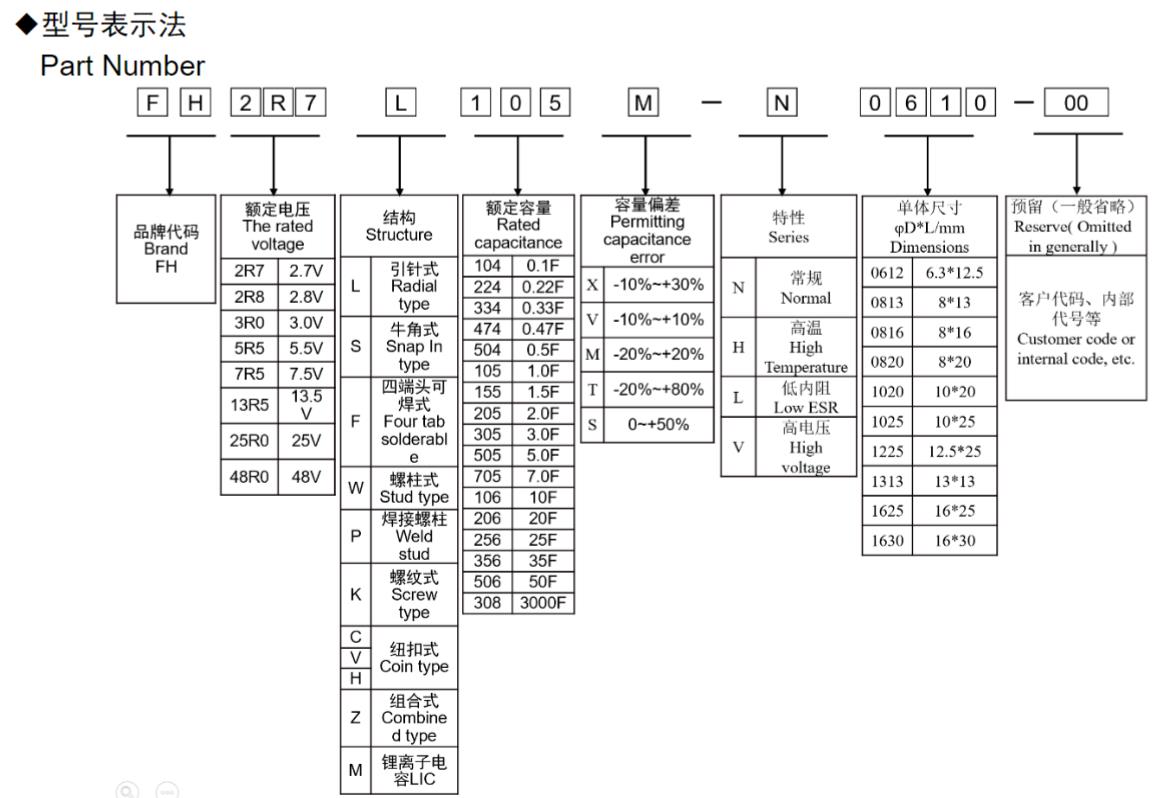 風(fēng)華高科高壓系列圓柱型超級(jí)電容器型號(hào)命名規(guī)則: