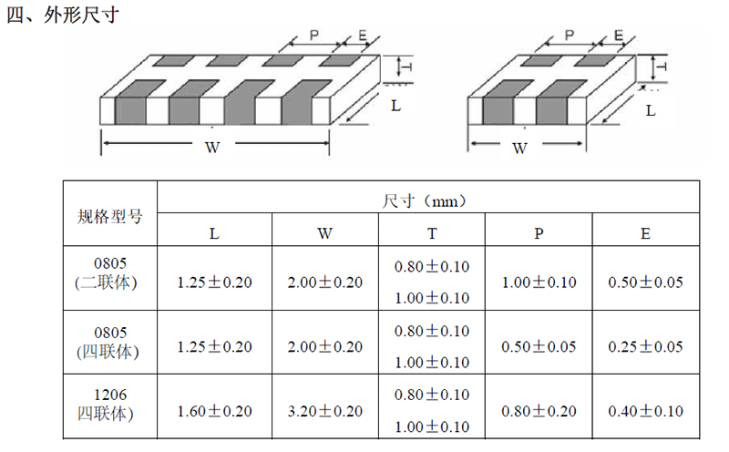 產(chǎn)品封裝:5082(0805二聯(lián)體)/5084(0805四聯(lián)體)/6124(1206四聯(lián)體)
