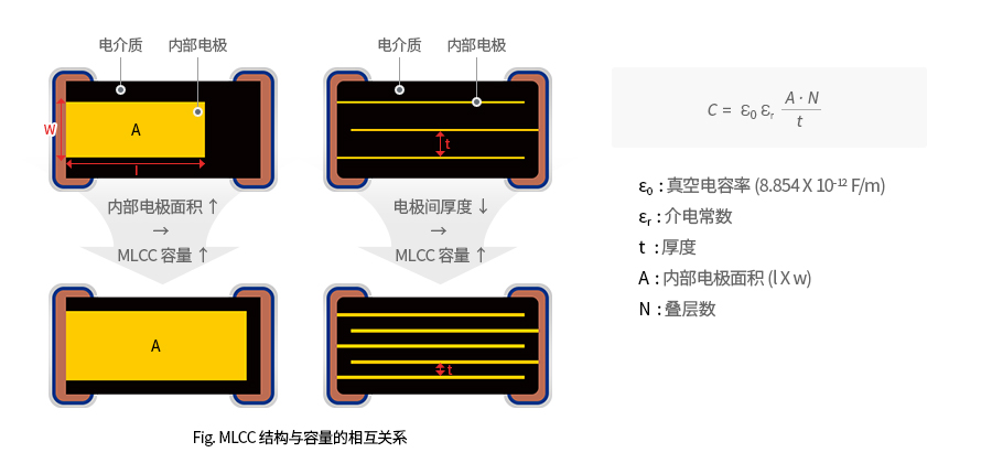 MLCC 容量如下所示,與電容率、內部電極面積、疊層數量呈成正比,與電介質厚度成反比。電介質厚度越薄,容量就會越高,這是電介質兩面所加電場數的差異導致的。